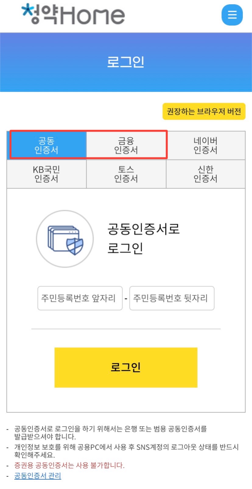 처음에는 은행 인증서로 로그인 했으나